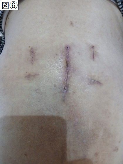 初めて立ち上がった時に、杖なしでも立ち上がれましたので、「杖なしで、2足歩行が可能」と思い、今回の手術は大成功であると喜びました。先生も傷口を見ながら「順調に回復しています」という励ましの言葉もいただきました。傷跡を写真にとると図⑥のようになります。まず、一番大きな切り口は背骨の真ん中のものです。骨や靭帯を削るために75mmの縦長の傷口があります。その切り口を真ん中にして右と左に縦型の切り口(30mm)、その下に横の切り口(20mm)があります。これらはチタンのスクリューを埋め込むための切り口です。これらの傷口を手で触ってみるとポコッとした膨らみがあります。