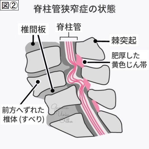 図②神経の狭窄状態(靭帯が肥厚し、神経を圧迫。すべりにより脊柱管が狭まり、神経を圧迫)