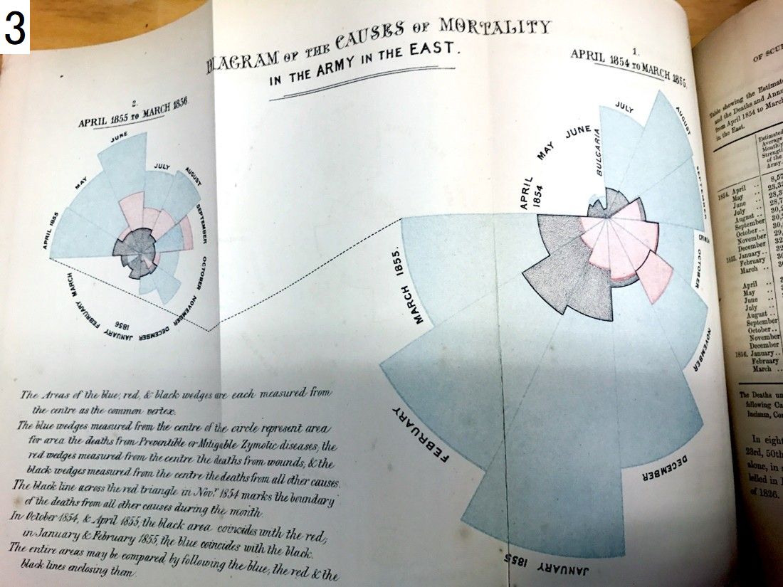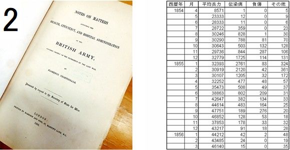 1.ナイチンゲール 2.表:ナイチンゲールの著書(左)と円グラフの元データ(右) 3.図:ローズ(中心からできる扇型の面積が死亡率の大きさに対応)